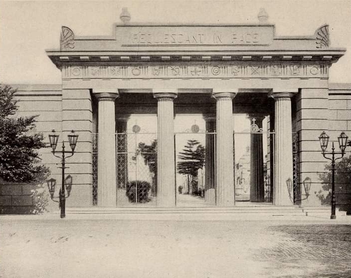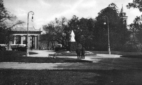 Unfortunately not available in a larger size, this image from a photobook published by Peuser in 1921 shows abundant landscaping —and few people— in the area just outside the main entrance gate.