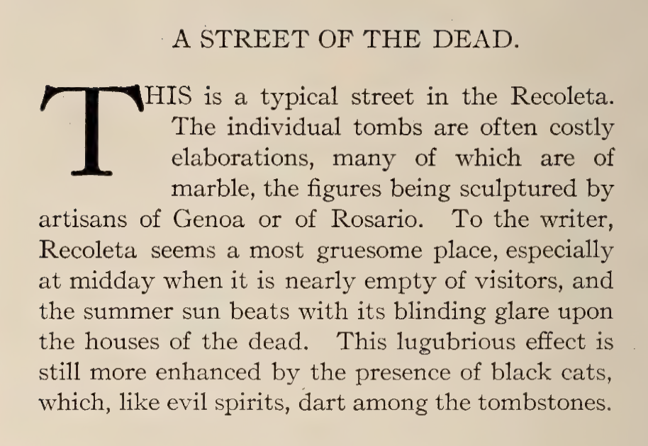 There is no grass in Recoleta. Just here and there, a little place for a tree, for a bush, which grow melancholically among surrounding death. Art, which uplifts sentiment toward noble ideals, appears in very few cases in the aristocratic necropolis. Beautiful monuments are still rare, and their number is certainly not in relation to that of the rich owners, nor to the development of good taste, which we sometimes notice in other aspects of our society in Buenos Aires.