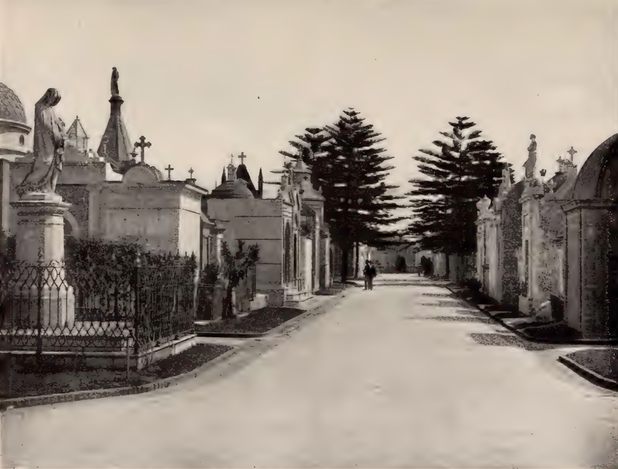 Recoleta Cemetery reproduces the city in its layout. It is the same checkerboard, crossed at some points by diagonals, the same, somewhat monotonous structures; the old ones in brick and lime plaster, the new ones with better materials: marble, granite, porphiry, bronze. Thus, the city of the dead was ennobled by contact with the modern spirit, and the tombs evolved in magnificence and solidity, following the same parallel as civil buildings.