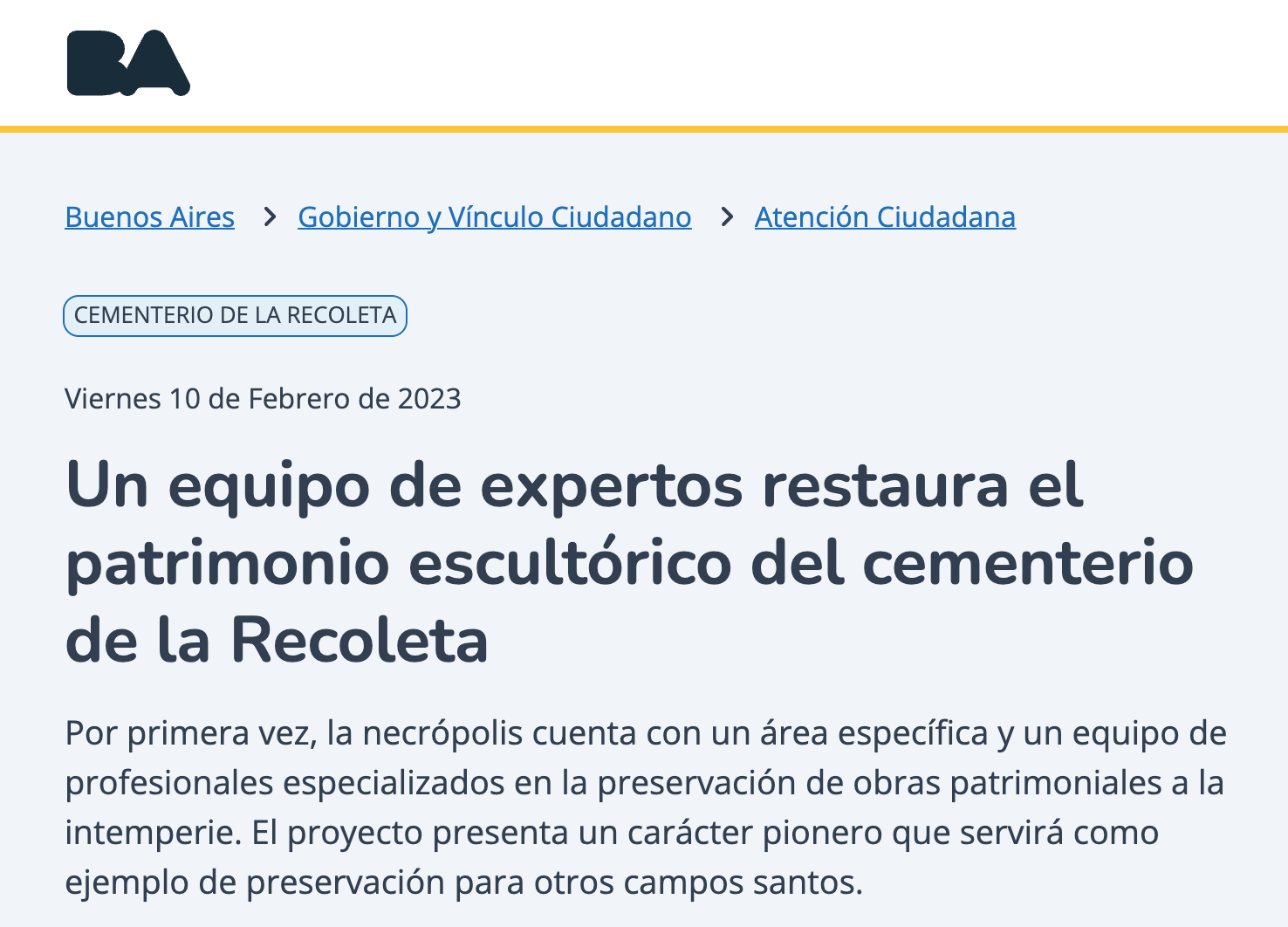 In Feb 2023, an official report published by the Buenos Aires city government announced the establishment of a specialized team to preserve & restore exposed art & architecture… naturally, their primary concern is Recoleta Cemetery. The original article can be found here, but below is our translation plus some additional information. Fantastic news!